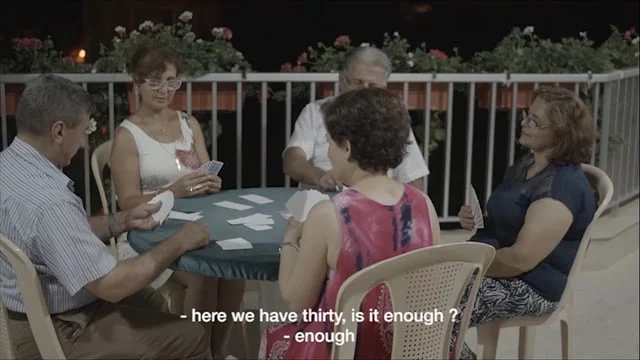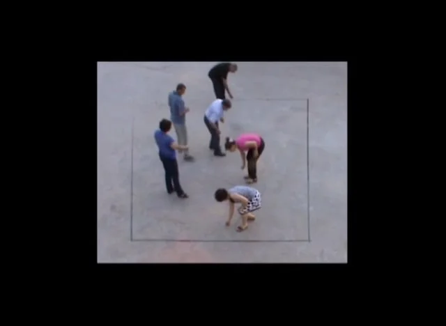 I invited a group of adults to play marbles, a game they used to play during their childhood. They are playing in a small space drawn on the ground as a reminder of the surface of the basement they used to hide in during the war.